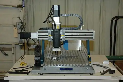 If more than four kinds of operations are needed, then multiple heads can be exchanged, or a second bridge installed further along the rails. By sharing the base rails and bridge for the main XYZ motions, less total equipment is required for multiple operations. This limits how many tasks can be done at the same time, but that is an acceptable compromise for a starter set. Figure 3 shows a small simple bridge mill which illustrates the basic shape and motion axes. It does not have many of the features noted here for a seed factory machine.