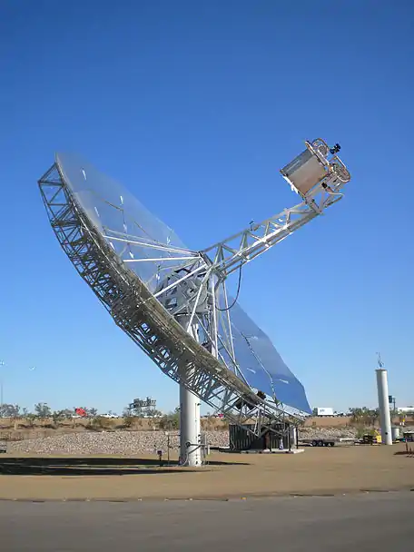 A furnace can make bricks and other ceramics, cement for concrete, melt metals for casting, and make glass for more furnaces and other uses. It can also make electricity by placing a steam boiler or concentrating solar cells at the focus, and store energy by piping the heat into a rock thermal storage bed. If more than one task needs to be done, multiple copies of the furnace can be built, or a larger version which shares the focus zone. The furnace may need auxiliary heating when sunlight is not sufficient or intermittent. Figure 2 shows a solar furnace with a different kind of mounting. The design we propose places a secondary mirror where this one has the target, and moves the target to a fixed location near the ground where it is more accessible.