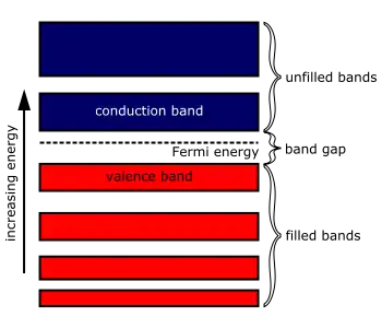 In a lattice, there will be a set of filled bands, with a full complement of electrons and unfilled bands which have no electrons (because they are in the lower-energy filled bands). The highest energy band with electrons in it is called the valence band, from the chemists' term "valence electrons" which are the electrons on the outermost shell of the atom which are responsible for chemical reactions. The conduction band is the band above the valence band. Electrons in the conduction band are free to move about in the lattice, and can therefore conduct current. The energy gap between the valence and conduction band is called the band gap.