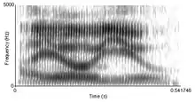 A speech spectrogram (careful with terminology here!) graphs frequency vs time & the intensity (amplitude, loudness) is coded by darkness. This shows qualitatively how speech sounds unfold over time. Note that consonants are noisy (not loud! but broadband in frequency). Vowels, in contrast have prototyped horizontal bands of energy. These bands are called formants. Near consonants, one or more of the formant curves - this is a formant transition. Most vowels are steady-state; they do not change over time (monophthongs). Some vowel sounds are dipthongs - they transition from one spectrum to another over the course of the vowel.