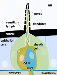 The sensory neurons are located on silia, hair-like structures on the antennae. Within those structures are the sensilium filters (also referred to as sensilia), a cuticular apparatus that contains a group of sensory neurons and their auxiliary cells. Each antennomer contains a few different types of sensilia and secretory gland cells and can be observed with scanning electron microscopy. The types of sensilia differ not only between ant species but are also specific to the gender and caste of the ant in question. Different types and functions of sensilia Based on the morphological features of the sensilia (for instance, the presence or absence of pores), one can speculate on their functions and how they serve a specific sensory modality. There are seven different types of sensilia each with their own types of inputs: [3]