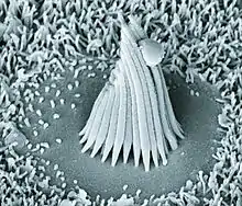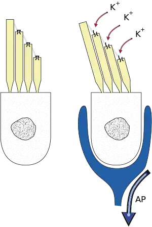 Hair cells are columnar cells, each with a bundle of 100-200 specialized cilia at the top, for which they are named. These cilia are the mechanosensors for hearing. The shorter ones are called stereocilia, and the longest one at the end of each haircell bundle kinocilium. The location of the kinocilium determine the on-direction, i.e. the direction of deflection inducing the maximum hair cell excitation. Lightly resting atop the longest cilia is the tectorial membrane, which moves back and forth with each cycle of sound, tilting the cilia and allowing electric current into the hair cell.