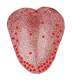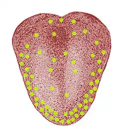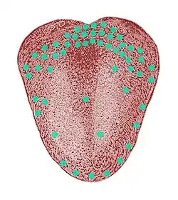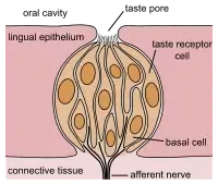 Taste buds are located in papillae along the surface of the tongue. There are three types of papillae in human: fungiform located in the anterior part containing approximately five taste buds, circumvallate papillae which are bigger and more posterior than the previous ones and the foliate papillae that are in the posterior edge of the tongue. Circumvallate and foliate papillae contain hundreds of taste buds. In each taste bud there are different types of cells: basal, dark, intermediate and light cells. Basal cells are believed to be the stem cells that give rise to the other types. It is thought that the rest of the cells correspond to different stages of differentiation where the light cells are the most mature type of cells. An alternative idea is that dark, intermediate and light cells correspond to different cellular lineages. Taste cells are short lived and are continuously regenerated. They contain a taste pore at the surface of the epithelium where they extend microvilli, the site where sensory transduction takes place. Taste cells are innervated by fibers of primary gustatory neurons. They contact sensory fibers and these connections resemble chemical synapses, they are excitable with voltage-gated channels: K+, Na+ and Ca+ channels capable of generating action potentials. Although the reaction from different tastants varies, in general tastants interact with receptors or ion channels in the membrane of a taste cells. These interactions depolarize the cell directly or via second messengers and in this way the receptor potential generates action potentials within the taste cells, which lead to Ca2+ influx through Ca2+ voltage-gated channels followed by the release of neurotransmitters at the synapses with the sensory fibers.