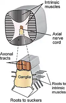 Behavioral experiments suggest that information regarding the movement of the muscles does not reach the learning centers of the brain, and morphological observations prove that the deep receptors send their axons to peripheral centers such as the ganglion of the sucker or the intramuscular nerve cords.[4] The information regarding the stretch or movement of the muscles is used in local reflexes only.