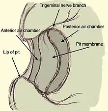 The infrared-sensing organs of vipers and boids are similar in their physiological structure but differ in their number, location and morphology. The anatomy is quite simple and will be explained in the example of the crotalus, a venomous pit viper found only in the Americas from southern Canada to northern Argentina. It consists of a hollow space that is separated into two air-filled chambers by a thin membrane of the thickness of 0.01 mm. It is filled with sensory cells of the trigenimal nerve (TNM). Roughly 7000 in number, they transduce the heat through heat sensitive ion channels, and increase their firing rate when a positive change in temperature occurs and decrease in the opposite case. They are very sensitive due to the spatial proximity of these thermoreceptors to the outside and also because of the air-filled chamber that lies underneath. This air-filled chamber works as an insulator in separating tissues that would otherwise quickly exchange heat energy. Thus, the absorbed thermal energy is used exclusively by the sensory system and is not lost to lower-lying tissues. This simple but sophisticated anatomy is the reason for the unique sensitivity of the pit organs. The pit organs’s physique allows even the detection of the radiation’s direction. The external opening is roughly half as large as the membrane. Thus, the whole organ works according to the optics of a pinhole camera: the position of the irradiated spot provides information about the object’s location. The heat itself is detected by the activation of heat sensitive ion channels called TRPA1. In other animals these channels also exist but have other functions like detecting chemical irritants or cold. Pit vipers and boids seem to have evolved the infrared-sensing independently. Since the heat sensitive ion channels have different thermal thresholds in different snakes, the temperature sensitivity differs among the snakes. Crotalus have the most sensitive channels. Snakes that are not able to detect infrared radiation also possess those channels, but their thermal threshold is too high to detect infrared radiation.