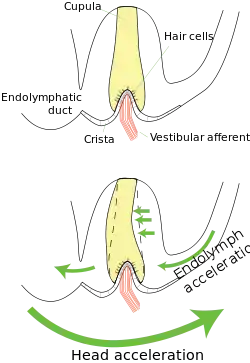 The three semicircular canals are responsible for the sensing of angular accelerations. When the head accelerates in the plane of a semicircular canal, inertia causes the endolymph in the canal to lag behind the motion of the membranous canal. Relative to the canal walls, the endolymph effectively moves in the opposite direction as the head, pushing and distorting the elastic cupula. Hair cells are arrayed beneath the cupula on the surface of the crista and have their stereocilia projecting into the cupula. They are therefore excited or inhibited depending on the direction of the acceleration.