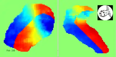 Excitation (red) and inhibition (blue) on utricle (left) and saccule (right), when the head is in a right-ear-down orientation. The displacement of the otoliths was calculated with the finite element technique, and the orientation of the haircells was taken from the literature.