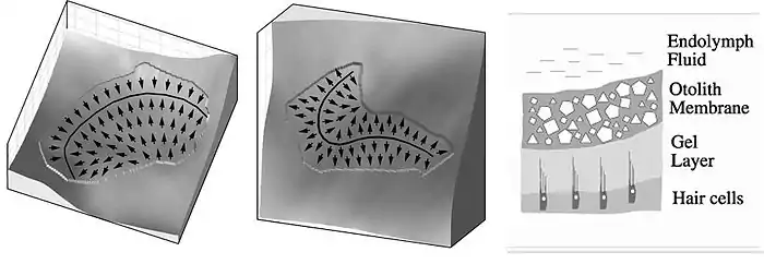 The otoliths are the human sensory organs for linear acceleration. The utricle (left) is approximately horizontally oriented; the saccule (center) lies approximately vertical. The arrows indicate the local on-directions of the hair cells; and the thick black lines indicate the location of the striola. On the right you see a cross-section through the otolith membrane. The graphs have been generated by Rudi Jaeger, while we cooperated on investigations of the otolith dynamics.