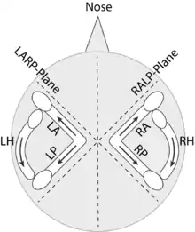 Orientation of the semicircular canals in the vestibular system. "L / R" stand for "Left / Right", respectively, and "H / A / P" for "Horizontal / Anterior / Posterior". The arrows indicate the direction of head movement that stimulates the corresponding canal.