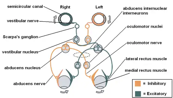 For example, when the head rotates rightward, the following occurs. The right horizontal canal hair cells depolarize and the left hyperpolarize. The right vestibular afferent activity therefore increases while the left decreases. The vestibulocochlear nerve then carries this information to the brainstem and the right vestibular nuclei activity increases while the left decreases. This makes in turn neurons of the left abducens nucleus and the right oculomotor nucleus fire at higher rate. Those in the left oculomotor nucleus and the right abducens nucleus fire at a lower rate. This results in the fact than the left lateral rectus extraocular muscle and the right medial rectus contract while the left medial rectus and the right lateral rectus relax. Thus, both eyes rotate leftward.