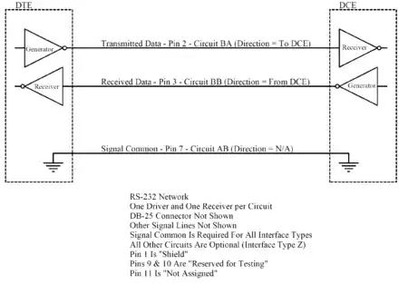 RS-232 network. One driver and one receiver per circuit. Signal Common is required for all interface types. Only Tx Data and Rx Data are shown. The DB-25 connector is not shown.
