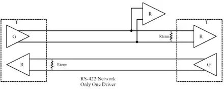 RS 422 network. May have multiple receivers. Only one driver per pair of wires is allowed.