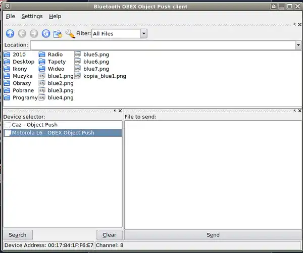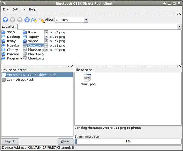 - 2. To send a file to the second device (a mobile) run the application from: Menu-> Network-> kbtobexclient.