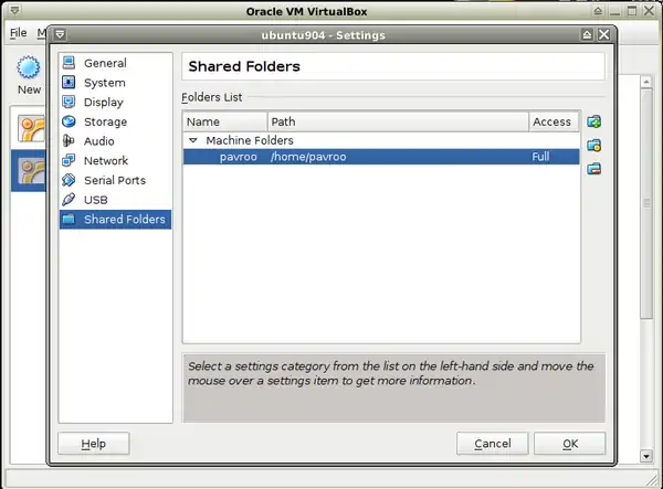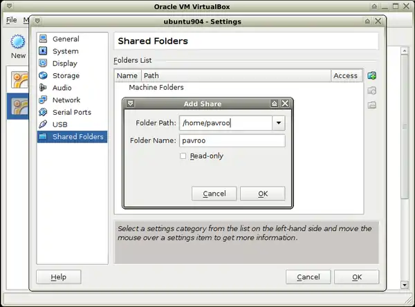 - 10. Shared folders-> add a folder/folders from the host system to share.
