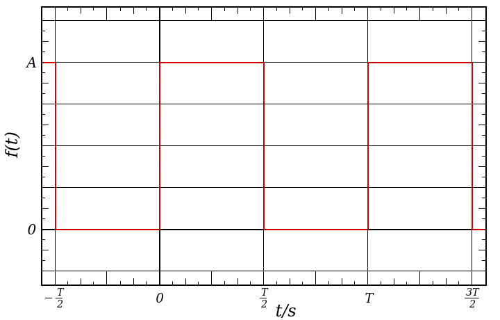 We will set the values as follows: A = 4 volts, T = 1 second. Also, it is given that the width of a single pulse is T/2.
