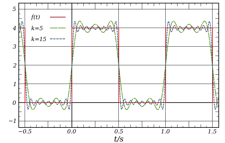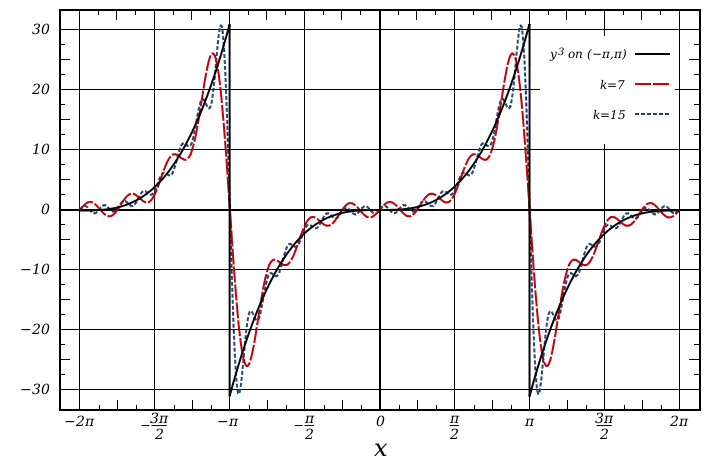 The graph below shows the approximation for the first 7 terms (red) and the first 15 terms (blue). The original function is shown in black.