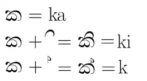 - When there is no vowel, a special sign, hal kirīma is added: "ක්" (/k/).
