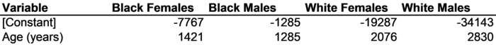 3.4. Comparing populations using predicted values (optional/advanced) In America, on average, women make less money than men and blacks make less money than whites. According to data on Americans aged 20-29 from the 2008 Survey of Income and Program Participation (SIPP), women earned $4966 less than men and blacks earned $6656 less than whites (on average). These figures are based on a random sample of 4964 full-time employed American twentysomethings in 2008. The data come from Wave 2 of the 2008 SIPP. Income here is defined as wage income (income earned through working a job, as opposed to making money through investments) and is calculated as twelve times the monthly income recorded in the SIPP. The gender gap in wage income is large, and the race gap is larger still. These gender and race gaps in wage income may be due to discrimination, or they may be due to other causes. For example, it is possible that the white men who were given the SIPP survey happened to be older than the people in the other groups. If they were older, they would be expected to have higher incomes. The white men may also be different in other ways. They might have more experience, or more education. It is possible that a portion of the gender and race gaps can be explained by the specific characteristics of the particular people in the sample. In order to compare incomes fairly, it's important to compare like with like. Later chapters of this book will discuss how to "control for" confounding influences like age, education, and experience, but predicted values can also do the job in some situations. For example, predicted values can be used to predict what the incomes in each group would be if all the people were the same age. People's incomes definitely rise with age, starting around age 20. Figure 3-10 reports the results of four regression models using age as the independent variable and wage income as the dependent variable: one for black females, one for black males, one for white females, and one for white males. Note that the intercepts are not very meaningful here. The intercept is the expected value of the dependent variable when the independent variable equals zero. In Figure 3-10, the intercept would represent people's expected wage incomes at age 0. Obviously, that's not a very meaningful concept. It's also an extreme extrapolation from the range of the observed data, which are based on people ages 10-29. In short, the intercepts in Figure 3-10 are just the places where the regression lines start from. They don't have any real meaning beyond that.