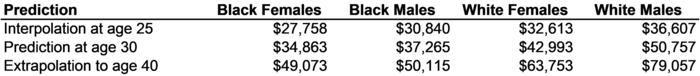 The slopes of the regression models reported in Figure 3-10 contrast the effects of an extra year of age on peoples' wage incomes for different groups of people. For black women, every additional year age yields, on average, an extra $1421 of wage income. Black men don't get quite as much advantage from getting a year older, just $1281. The big difference comes with white women and men. For white women, each year of age yields on average an extra $2076 of wage income. The benefits of age for white men are even greater. For white men, every year of age yields on average an extra $2830 of wage income. The expected payoff of an extra year's age for a white man is nearly twice as high as the average payoff for a black woman. The coefficients of the for regression models reported in Figure 3-10 can be used to calculate predicted values for the wage incomes of black females, black males, white females, and white males at any given age. From Figure 3-10, the regression model for black women was Wage income = -7767 + 1421 x Age. For black women of various ages, this works out to: Age 25: Wage income = -7767 + 1421 x 25 =$27,758 Age 30: Wage income = -7767 + 1421 x 30 =$34,863 Age 40: Wage income = -7767 + 1421 x 40 =$49,073 These figures are reported in Figure 3-11 in the column for black females. Figures for black men, white women, and white men are calculated in the same way. The prediction of wage income at age 25 for each group is an interpolation, since the ages of the SIPP participants in the study were 20-29. As an interpolation, it should be a pretty accurate estimate of the incomes of 25-year-olds in each category would be expected to earn. The prediction of wage income at age 30 is on the very edge between an interpolation and an extrapolation, so it might be less reliable. The prediction of wage income at age 40 is an extrapolation far out into the future, so far that most social scientists would not trust it at all. The age 40 extrapolation is included here just to illustrate how extrapolation works.