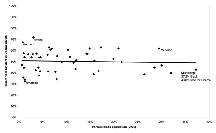 3.5. Case study: Predicting state election outcomes based on race On November 4, 2008, Barack Obama was elected the first black President of the United States. President Obama's father was Kenyan and Barack Obama himself grew up mainly in Hawaii, far from the historical center of American civil rights struggles. Nonetheless, like any black American Obama would have been affected by racial discrimination throughout his life. Both Obama and America overcame racial discrimination when Obama was elected President, but was his race a factor in his election? Regression models can help shed light on the role played by race in the 2008 election. Most of the time discrimination hurts a person, but sometimes it can also help a person. In the 2008 presidential election, black Americans voted overwhelmingly for Barack Obama. According to CNN news, exit polls on election night indicated that 96% of blacks voted for Obama. These votes certainly helped Obama win the election, but American elections aren't determined just by the number of people who vote for a candidate. They are determined by state electoral votes. In most states, whoever receives the most votes within the state gets all of that state's electoral votes. Thus, it is possible to win the most votes but still lose the election. This happened to Al Gore in 2000, when he won more people's votes than George Bush but fewer state electoral votes. In the 2008 election, Obama won both the most people's votes and the most state electoral votes, and so was elected President. Strangely, though, he lost the election in some of the states that have the highest black populations. For example, Mississippi has the highest percentage of blacks of any state in the United States (37.2% black), but Obama received only 43.0% of the vote in Mississippi and lost the state to his opponent, John McCain. The same thing happened in other heavily black states, like Alabama and Louisiana. The relationship between the percent of a state's population that is black and the percent of a state's voters who voted for Obama is plotted in Figure 3-12. It turns out that there was almost no relationship between a state's black population and its presidential vote in 2008. The slope of the regression line is actually slightly negative. This means that states with higher black populations tended to vote slightly less for Obama. The highest vote for Obama was in the state where he grew up, Hawaii (71.9%). The very lowest vote for Obama was in the historically Republican western states of Wyoming (32.5%).