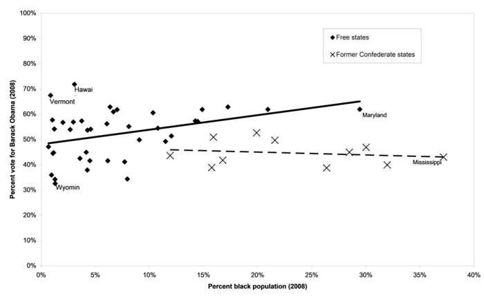 How is it possible that there was no relationship between the number of blacks in a state and the vote for Obama in that state, given that 96% of black Americans voted for Barack Obama? The answer is that in many states with large numbers of blacks, whites voted overwhelmingly for his opponent, John McCain. This trend was particularly pronounced in the South. The historical center of the struggle for civil rights for black Americans has always been the South, in particular the 11 states of the former Confederacy that seceded from the United States during the Civil War (1861-1865). The 11 Confederate states were strongly committed to continuing the institution of slavery, and after being readmitted to the Union they put in place policies and laws that discriminated heavily against their black citizens. Black Americans have suffered discrimination everywhere in the United States, but the levels of discrimination in the 11 former Confederate states have historically been much worse than elsewhere. Figure 3-13 plots exactly the same data as Figure 3-12, but divides the states into the 39 "free" states that were never part of the Confederacy versus the 11 former Confederate states that seceded from the United States during the Civil War. The free states are marked with diamonds and the former Confederate states are marked with X's. Separate regression lines have been plotted for the two groups of states. Among the 39 free states, states with higher black populations returned higher votes for Obama, as would be expected. Among the 11 former Confederate states, states with higher black populations actually returned lower votes for Obama.