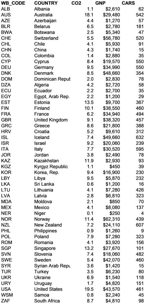 Global warming is one of the greatest threats facing the world in the 21st century. Climate scientists are now absolutely certain that global warming is occurring and that it is related to human activity. The most obvious cause of global warming is fossil fuel consumption (though there are many other causes). Fossil fuels are minerals like coal, oil, and natural gas that were buried under the Earth's surface millions of years ago. Over the long history of the Earth, enormous amounts of carbon have been removed from the atmosphere by natural processes and deposited in the ground as minerals. Then, starting for real in the 1800s but gaining momentum in the 1900s through to today, we began digging and pumping these minerals out of the Earth to burn in our homes, power plants, and automobiles. Whenever we burn these carbon minerals, we release carbon dioxide (CO2) into the atmosphere, which leads to global warming. Global warming may seem like a topic for physical scientists to study, but really it is a social science topic. Physical scientists have told us how to stop global warming: if we just stop burning fossil fuels, the Earth will stop warming and eventually return to normal. The problem is that people don't want to stop burning fossil fuels. Changing people's attitudes and behavior is a social science problem. Figure 3-1 is an extract of data from a World Bank database called the World Development Indicators (WDI). The cases in the WDI database are countries. The columns of the database include two metadata items (the World Bank country code and the country name). Three variables are also included: CO2 -- Metric tons of carbon dioxide per person emitted by the country GNP -- The country's gross domestic product per capita, a measure of average national income CARS -- The number of passenger cars per 1000 residents of the country Countries were excluded where data were unavailable. For example, the WDI database included no passenger car data for Canada, so Canada is not included in Figure 3-1 or in the analyses to follow. Lack of data is the reason that the database includes data for only 51 out of the 200 or so countries of the world.