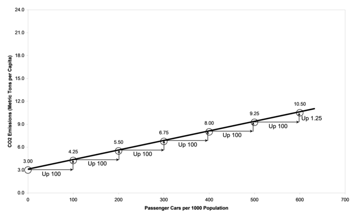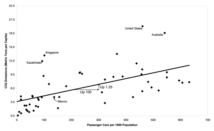 Using this equation, it is possible to calculate the expected value of carbon emissions for any level of passenger cars. For example, the level of passenger cars in the United States is 461 cars per 1000 people. Using the equation presented in Figure 3-6, the expected value of carbon dioxide emissions in the United states = 3.00 + 0.0125 x 461 or 8.7625 metric tons per capita. Rounding off to the nearest decimal place gives an expected value of carbon emissions in the United States of about 8.8 metric tons per capita. The actual value of carbon emissions in the United States, 19.5 metric tons, is obviously much higher than expected. As suggested above, this is because nearly half of all Americans drive SUVs and trucks, not cars.