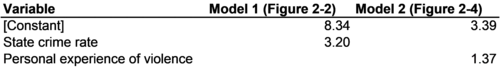 The slope associated with the independent variable "Cars" (0.0125) is listed next to the entry for "Cars." If there were more independent variables, they would be listed in additional rows. Similarly, if there were more regression models, they would be listed in additional columns. Regression tables are especially convenient for reporting the results of several regression models at the same time. In Chapter 2, the percent of Australians who felt unsafe walking alone at night was regressed on state crime rates (Figure 2-2) and personal experiences of violence (Figure 2-4). Instead of using scatter plots, the results of these two regression analyses can be summarized compactly in a single table, as shown in Figure 3-5. All of the coefficients associated with both models are reported in this one table.