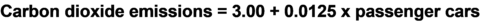 3.2. Calculating expected values Tables of regression coefficients that include slopes and intercepts can also be used to compute the expected values. This should not be surprising, since slopes and intercepts are used to plot regression lines and expected values are just the values on the regression line. Returning to the relationship between passenger cars and carbon dioxide emissions, the slope is 0.0125 and the intercept is 3.00 (Figure 3-4). The slope and intercept define the regression line: the line starts at 3.00 tons of carbon emissions when the number of cars equals 0, then goes up by 0.0125 tons for every 1 additional car. An increase of 0.0125 for every car is the same as 125 for every 100 cars (Figure 3-5). As shown in Figure 3-3, the expected value of carbon emissions for 0 cars is 3.00 tons. For 100 cars the expected value is 4.25 tons. For 200 cars it is 5.50 tons. And so on. Reading expected values off a chart like Figure 3-2 or Figure 3-3 is one way to find them, but a better way is to use the slope and intercept in an equation to compute them. For example, the equation to compute expected values of carbon emissions is depicted in Figure 3-6. This equation uses the slope and intercept for carbon emissions that were reported in Figure 3-4. These are the same slope and intercept that were also used in the scatter plots of carbon emissions versus passenger cars.