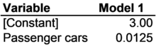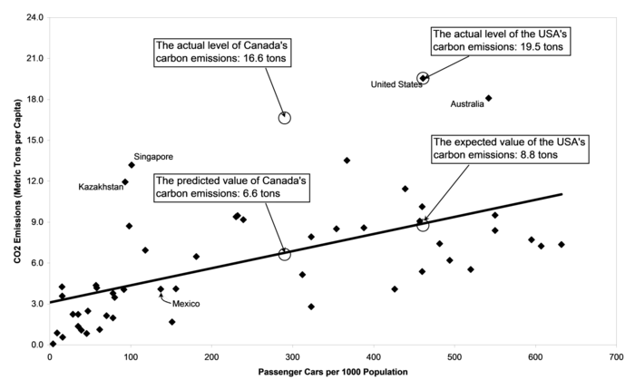 3.3. Predicted values Another use of regression coefficients is to predict levels of the dependent variable for cases that were not included in the regression analysis. Predicted values are expected values of a dependent variable that correspond to selected values of the independent variable. In other words, we can use the equation of a regression line to make predictions. For example, Canada was not included in the carbon dioxide analyses in this chapter because the WDI database (Figure 3-1) was missing passenger car data for Canada. Even though passenger car data for Canada are not available from the WDI, they are available from the Canadian government. According to official Canadian government statistics, there were 290 passenger cars per 1000 people in Canada in 2005. This figure is so low because like Americans almost half of all Canadians drive trucks and SUVs instead of cars. The equation of the regression line for carbon dioxide emissions says that expected carbon dioxide emissions = 3.00 + 0.0125 x passenger cars (Figure 3-6). Using the Canadian government data for passenger cars in Canada, 3.00 + 0.0125 x 290 = 6.625, which rounds off to about 6.6 tons. The actual value for carbon emissions for Canada was 16.6 tons. These figures are graphed in Figure 3-7. Like the United States, Canada has much higher carbon emissions than would be expected based on the regression model.
