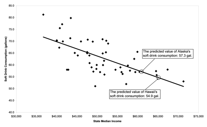 This equation can be used to calculate predicted values for soft drink consumption in Alaska and Hawaii. Alaska's state median income is approximately $61,000 (rounding off to the nearest thousand to simplify the calculations). The level of soft drink consumption in Alaska predicted by the regression model is 93.9 - 0.60 x 61 = 57.3 gallons. Hawaii's state median income is approximately $65,000 (again rounding to the nearest thousand). Going through the same process for Hawaii gives a predicted value of 93.9 - 0.60 x 65 = 54.9 gallons. The predicted values of soft drink consumption are depicted on the scatter plot of state income and soft drink consumption for the other 48 states and the District of Columbia in Figure 3-9. Alaska and Hawaii may not have exactly the levels of soft drink consumption plotted in Figure 3-9, but these predicted values are the best guesses we can make based on the data we have. They are predictions of how many gallons of soft drinks Alaskans and Hawaiians would be found to drink, if we had the data.