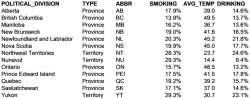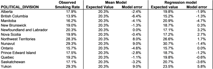 4.2. Models, parameters, and degrees of freedom Smoking causes more preventable disability and death worldwide than any other human activity. It is an incredibly important challenge to the world's health. In Canada, about 17.9% of the adult population identify themselves as smokers (Health Canada data for 2008). Smoking rates, heavy drinking rates, and temperatures across the 13 Canadian provinces and territories are summarized in the database in Figure 4-8. The mean rate of smoking across these 13 political divisions is 20.3%. This differs from the overall national average because several low-population provinces and territories have high smoking rates. A mean model for smoking rates in Canadian provinces and territories would suggest that smoking rates equal an expected value of 20.3% plus or minus some error in each case.