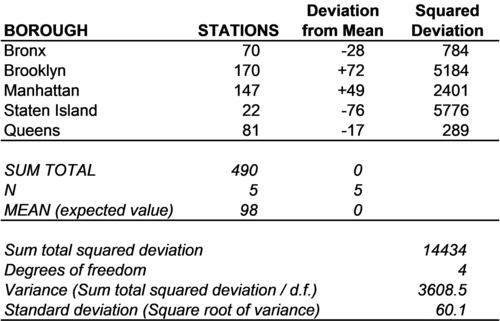 4.4. Calculating variance and standard deviation (optional/advanced) There is rarely any need to calculate the variance and standard deviation of a variable or of the error in a mean model or linear regression model. Statistical computer programs, spreadsheet programs, and even calculators all are able to calculate standard deviation. On the other hand, unlike calculating regression coefficients, calculating standard deviation is not too difficult. There are six steps in the calculation of the standard deviation of a variable. They are: (1) Calculate the mean of the variable (2) Calculate deviations from the mean for each case of the variable (3) Square these deviations (4) Sum up all the deviations into total squared deviation (5) Divide total squared deviation by the degrees of freedom to arrive at variance (6) Take the square root of variance to arrive at standard deviation These six steps in the calculation of standard deviation are illustrated in Figure 4-13 using data on the number of subway stations in each borough of New York City. Including the 22 stations of the Staten Island Railway as subway stations, there are a total of 490 stations in the five boroughs. Dividing 490 by 5 gives a mean number of subway stations per borough of 98 (Step 1). Each borough's deviation from this mean of 98 stations is given in the table (Step 2). To the right of the deviations are the deviations squared (Step 3). The sum total of these squared deviations is 14434 (Step 4). Since there are five boroughs, and the deviations in Figure 4-13 are deviations from a mean model (not a regression model), there are 4 degrees of freedom (5 - 1 = 4). Dividing the total squared deviation by the degrees of freedom (14434 / 4) gives the variance of the number of subway stations per borough.
