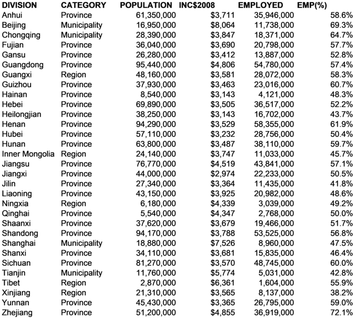 4.5. Case study: Income and wage employment in China China has been experiencing extraordinarily rapid rates of economic growth since the late 1990s. Nonetheless, China as a whole is still a relatively poor country. It's average income levels are less than half that of Mexico. One characteristic of poor countries all over the world is that many people live off the land growing their own food instead of working for pay. As incomes rise, more and more people move off the land to seek employment in factories and other workplaces that pay money wages. In China today, millions of people are moving from small farming villages to new urban areas every year, making the transition from subsistence farming to wage labor. Social scientists debate whether people are better off as subsistence farmers or better off as wage laborers, but either way the trend is unmistakable. Millions of Chinese join the ranks of wage laborers every year. Like Canada and Australia, China had more than one kind of administrative division. In China, there are 4 independent municipalities (the biggest cities in the country), 22 provinces, and 5 "autonomous regions" that have large minority populations and have different administrative procedures than regular provinces. There are also two "special administrative regions" (Hong Kong and Macau) that for historical reasons are not included in many Chinese data. In addition, China claims ownership of but does not control the island of Taiwan. All told, most Chinese datasets include variables for the 31 main divisions, excluding Hong Kong, Macau, and Taiwan. A database containing population, income, and employment data for these 31 divisions is reproduced as Figure 4-14.