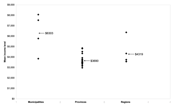 Two variables in Figure 4-14 are particularly interesting for understanding the transition from subsistence agriculture to wage labor. The variable INC$2008 is the mean income level for wage earners in each administrative division, and the variable EMP(%) is the labor force participation rate (the proportion of people in each division who are employed in formal wage labor). Conditional mean levels of income, conditional on the type of division, are plotted in Figure 4-15. The mean income level in each type of division (municipality, province, or region) is reported on the graph. The four municipalities are much richer than the provinces and regions, but there is one relatively poorer municipality, Chongquing, which is inland deep in the middle of China. There is one apparently rich region, Tibet, but in fact Tibet is relatively poor. The very high cost of living in Tibet keeps wages higher than they otherwise might be.