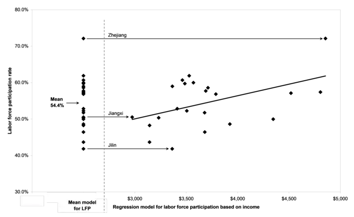 Figure 4-16 contrasts two models of labor force participation for the 22 Chinese provinces. Figure 4-16 focuses on the provinces because there are more provinces than other divisions and municipalities and regions are different in many ways from provinces. The left side of Figure 4-16 presents a mean model with 21 degrees of freedom for labor force participation (marked LFP). The mean level of labor force participation across the 22 provinces is 54.4%, with a standard deviation of 6.9%. All provinces except Zhijiang have labor force participation rates that fall within two standard deviations of the mean. The right side of Figure 4-16 presents a linear regression model with 20 degrees of freedom that regresses labor force participation (dependent variable) on mean income level (independent variable). The parameters of this model are reported in Figure 4-17.