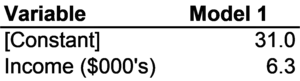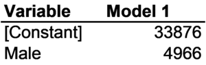 The coefficients of the regression of income on gender are reported in Figure 4-6. In this regression model, the independent variable is gender (coded as "maleness": 0 for women and 1 for men) and the dependent variable is wage income (defined as income earned through working a job and calculated as twelve times the monthly income recorded in the SIPP). The regression model has an intercept of 33876 and a slope of 4866. In other words, the equation for the regression line is Income = 33876 + 4966 x Male. For women (Male = 0), the expected value of wage income is 33876 + 4966 x 0 = 33876 + 0 = $33,876. For men (Male = 1), the expected value of wage income is 33876 + 4966 x 1 = 33876 + 4966 = $38,842. In other words, the conditional mean income for women is $33,876 while the conditional mean income for men is $38,842.