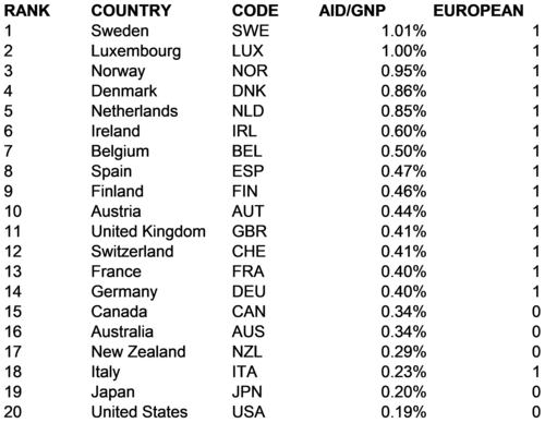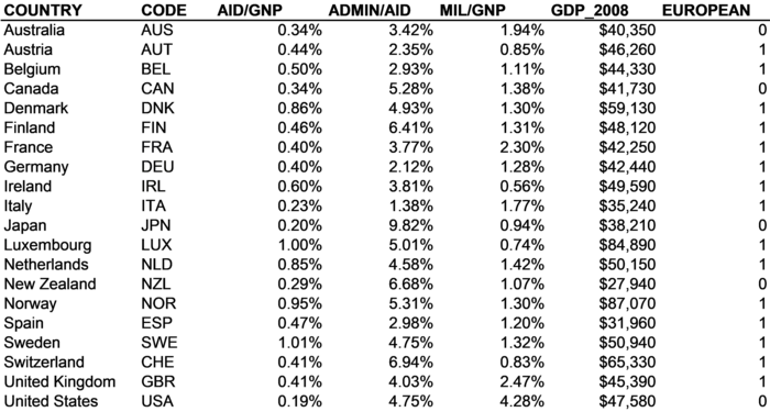 North Americans, Europeans, Japanese, Australians, Koreans, and New Zealanders, and people in a few other countries are very lucky. However difficult life may be for individual people, our countries are very rich. If we in the rich world have problems like poverty, homelessness, and malnutrition, it's because we choose to have them. We could always just decide to spend the money to make sure that everyone could live a decent life. We may choose not to spend the money, but at least we have the choice. National income per person in the rich countries of the world is typically $30,000 - $45,000 per person per year, and all of the rich countries of the world have democratic governments. It's up to us to decide how we want to spend our resources. In many of the poorer countries of the world, the resources simply do not exist to make sure that everyone has a decent standard of living. What's worse, many of these countries aren't democracies, so even where resources do exist people don't necessarily have the power to choose to share them out equally. As a result, over one-third of the world's children under age 5 are stunted (shorter than they should be) due to malnutrition. Over 20% of the world's population can't afford to eat on a regular basis. About 40% of the people of the world -- roughly 2.5 billion people -- when they have to go to the bathroom literally shit on the ground. Another 30% use outhouses. Only about 30% of the world's people have toilets with running water. It's hard to wash after you wipe if there's no running water in your bathroom. Most rich countries make some effort to help make conditions better for the world's poor. Some basic data on rich countries' overseas development assistance (ODA) budgets are presented in Figure 4-1. Overseas development assistance is the amount a country spends on aid to help people in poorer countries. This database draws together data from the World Bank and the Organization for Economic Cooperation and Development (OECD). The cases in the database are 20 of the richest countries in the world, including the United States. Included are two metadata items, the countries' names and three-digit country codes. Four variables are also included: AID/GNP -- a country's ODA spending in relationship to its total national income ADMIN/AID -- the proportion of a country's aid that is spent on administrative costs MIL/GNP -- a country's military spending in relationship to its national income GDP_2008 -- a country's level of national income per capita EUROPEAN -- an indicator that a country is European (1) versus non-European (0)