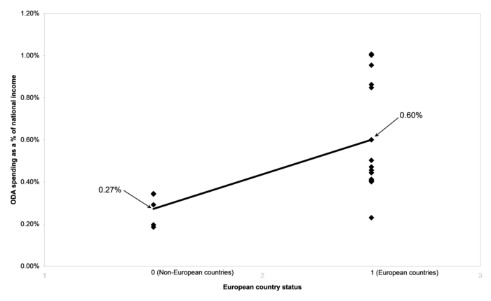 An interesting pattern in ODA spending that is made clear by Figure 4-2 is that all of the most generous countries are European. We might generalize from this observation to hypothesize that European country status is an important determinant of ODA spending levels. The results of a regression of ODA spending on European country status are reported in Figure 4-3. The intercept is 0.27, which is the expected value of ODA spending when European status = 0. In other words, rich non-European countries tend to give about 0.27% of their national incomes. The regression coefficients in Figure 4-3 can also be used to calculate the expected value of ODA spending for European countries. For European countries, European status = 1, so ODA spending = 0.27 + 0.33 x 1 = 0.60% of national income. This expected value could be used to predict ODA spending in a rich European country that was not included in the database, like Liechtenstein. Based on the regression reported in Figure 4-3 the predicted value of ODA spending for Liechtenstein would be 0.60% of national income. Since Liechtenstein is a European country (European status = 1), this prediction would be an interpolation, not an extrapolation.