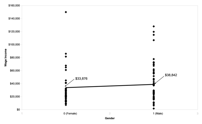 4.1. The mean model As Figure 4.4 demonstrates, a regression model can be used to calculate the expected value of Overseas Development Assistance (ODA) either for non-European countries or for European countries. The expected value of a dependent variable for a specific group of cases (like non-European or European countries) is known as a conditional mean. Conditional means are the expected values of dependent variables for specific groups of cases. Another example of the use of conditional means is illustrated in Figure 4-5. Figure 4-5 depicts a scatter plot and regression of wage income on gender using data for employed Americans aged 20-29 from the 2008 US Survey of Income and Program Participation (SIPP), Wave 2. The SIPP database includes 4964 cases (2208 women and 2756 men). Since these would be too many to plot on a scatter plot, 100 random cases (46 women and 54 men) have been graphed in Figure 4-5 to illustrate what the data look like.