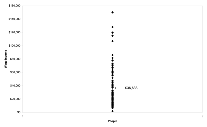 If it's possible to calculate conditional mean incomes based on people's genders, it should be possible to calculate the mean income for people for people in general. Means are the expected values of variables. What would happen if we put all 4964 people in the SIPP database together into one big group and calculated the expected value of their income? The result would look something like Figure 4-7, which takes the 46 women and 54 men from Figure 4-5 and groups them into a single category called "people."