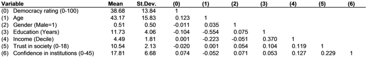 Correlation matrices can be used both to pick out which independent variables are likely to be significantly related to the dependent variable. For example, in Figure 8-15 the variables that are most closely related to the democracy rating are age, education, and confidence in institutions. Correlations matrices can also be used to pick out which independent variables are likely to compete with or complement each other based on what independent variables are correlated with each other. Highly correlated groups of variables like age, education, and income, or trust and confidence, are likely to compete with or complement each other. Variables that are not correlated with each other are unlikely to be either competing or complementary when used in a regression model. Differentiating between competing and complementary controls based on the correlation matrix, however, is difficult or impossible.