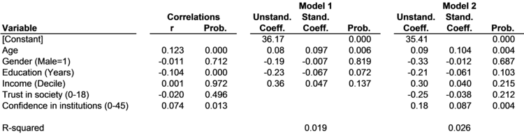 The first column of results in Figure 8-16 reports the correlations of the democracy rating with each of the six independent variables. Only three of these correlations are statistically significant: those for age, education, and confidence in institutions. Figure 8-16 also reports the results of two regression models. For each model, both unstandardized coefficients and standardized coefficients are reported. The unstandardized coefficients are just the ordinary regression coefficients based on the unstandardized variables for each of the variables in the model. The standardized coefficients are the regression coefficients that result from the same regression model estimated using standardized variables. The standardized coefficients in Model 1 indicate that age has the most powerful effect on the democracy rating of any of the four variables included in the model. In Model 2, confidence in the institutions of society (including government) is positively associated with people's ratings of their country's democracy. This makes sense, since people who have no confidence in government would be unlikely to rate their government as being very democratic. Surprisingly, trust in society has no significant effect on people's ratings of how democratic their government is in Taiwan. The R2 statistics for both models are shockingly low. The R2 of 0.019 for Model 1 indicates that the variables in Model 1 altogether explain only 1.9% of the total variability in people's ratings of Taiwan's democracy. The R2 rises as variables are added in Model 2, but at 0.026 (2.6%) it is still very low. These low R2 scores call into question the substantive significance of the two models. Both models have statistically significant coefficients, but a model that explains less than 3% of the total variability in the dependent variable may not be very useful from a policy standpoint. The real reasons behind people's ratings of the level of democracy of their own government remain a mystery, at least in Taiwan.