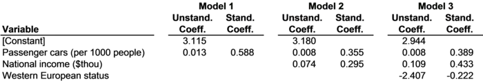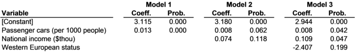 We all know that when we drive, our cars pollute the atmosphere. We can literally see, feel, hear, and smell the pollution coming out of our exhaust pipes. Of course, cars aren't the only source of air pollution. Almost everything we do in modern society causes air pollution, and in particular the emission of carbon dioxide (CO2) into the atmosphere, which cases global warming. Shopping causes CO2 emissions because of all the energy used to get products into the stores in the first place. Sending an e-mail (CO2) emissions because of the electricity used by our computers. Eating causes CO2 emissions because of the electricity and gas used by our kitchen appliances. Even sleeping causes CO2 emissions if we use air conditioning or heating in our bedrooms, listen to music, or set an alarm clock. There's no way around it: simply living in modern society pollutes the air and contributes to global warming. In Chapter 3, countries' levels of CO2 emissions were regressed on their numbers of passenger cars in a simple linear regression model of CO2 emissions. Given that CO2 emissions come from multiple sources, not just passenger cars, it seems like a multicausal model would be more appropriate. Ideally, a multicausal model of CO2 emissions would include all sorts of variables, like electricity usage, air, rail, and truck transportation, agricultural CO2 emissions, and other sources of pollution. The inclusion of all of these variables in a multiple linear regression model would help create a model that might predict CO2 emissions very accurately, since all the contributors to CO2 emissions would be accounted for. A much simpler multicausal model of CO2 emissions is presented in Figure 8-1. Using data from Figure 3-1, tons of CO2 emissions per person in 51 countries are regressed on three predictors: passenger cars per 1000 people, national income per person, and western European status. Theoretically, greater numbers of passenger cars and higher overall national income per person should be associated with higher levels of CO2 emissions. Western European status should be associated with lower levels of CO2 emissions, since western European countries have been very active in promoting action on climate change in recent years. Three models are presented in Figure 8-1: a simple linear regression model based on passenger cars (Model 1), a multiple linear regression model that adds national income (Model 2), and an additional multiple linear regression model that also adds European status (Model 3).