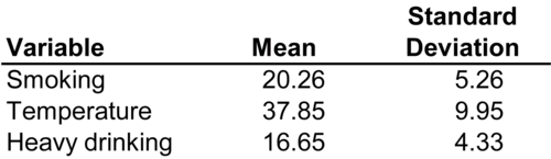 Australia also has a large number of cars per 1000 people, 542 cars versus a cross-national mean of 242 cars. Australia's level is more than 1 standard deviation above the mean, but not quite 2 standard deviations. Australia's national income level of $29,480 is well above the mean, but by a little less than 1 standard deviation. It's actually just 0.83 standard deviations above the mean. So while Australia is around 1 standard deviations above the mean on passenger cars and national income, it's more than 2 standard deviations above the mean on CO2 emissions. This suggests that CO2 emissions are especially high in Australia. Looking back at Figure 3-2, this seems to be the case: Australia's observed CO2 emissions are much higher than its expected levels as indicated by the regression line. Australia is a clear outlier. On the other hand, Mexico is 0.47 standard deviations below the mean on CO2 emissions, 0.51 standard deviations below the mean on passenger cars, and 0.42 standard deviations below the mean on income. It is below the mean by roughly the same amount on all three variables. It is also much closer the mean on all three variables than Australia is, at least in terms of standard deviations. For example, where Mexico is 0.47 standard deviations below the mean on CO2 emissions, Australia is 2.75 standard deviations above the mean. Discussing variables in terms of standard deviations above or below the mean is actually a very useful technique. Instead of computing standard deviations above or below the mean for particular cases, it makes more sense to convert all the values of a variable into standard deviations above or below the mean at the same time in a process called "standardization." Standardized variables are variables that have been transformed by subtracting the mean from every observed value and then dividing by the standard deviation. Because of the way they are constructed, standardized variables always have a mean of 0 and a standard deviation of 1. Also because of the way they are constructed, standardized variables have no units. For example, Mexico is 0.42 standard deviations below the mean on national income. It is not 0.42 dollars below the mean or 0.42 percent below the mean. It is just 0.42 standard deviations below the mean. This is the only downside of standardized variables: they have no units. When social statisticians are interested in doing something that requires the original units, like using a regression model to make predictions, they need the original units. Unstandardized variables are variables that are expressed in their original units. All variables start out as unstandardized variables, expressed in dollars, pounds, percentages, cars per 1000 people, or some other unit. In general, "unstandardized variables" are just "variables." The term "unstandardized variable" is only used to when it is necessary to distinguish an unstandardized variable from a standardized variable. The most important use of standardized variables is in linear regression models. In Figure 7-13, smoking rates in the 13 Canadian provinces and territories were regressed on average daily temperatures and rates of heavy alcohol drinking. Both temperature and heavy drinking were statistically significant predictors of smoking rates, but since they are recorded in different units (degrees versus percents) their effects were difficult to compare. Standardizing all three variables (smoking, temperature, and drinking) makes possible a meaningful comparison of the effects of temperature and drinking on smoking rates. The first step in standardizing variables is to find their means and standard deviations. Means and standard deviations for all three variables are reported in Figure 8-3. The second step is to use these means and standard deviations to convert each value of each variable into a standardized value.