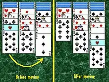 - Groups of cards can be moved; the cards below the one to be moved do not need to be in any order, except that the starting and target cards must be built in sequence and in alternate color. For example, a group starting with a Red 3 can be moved on top a Black 4, and the cards below the Red 3 can differ.