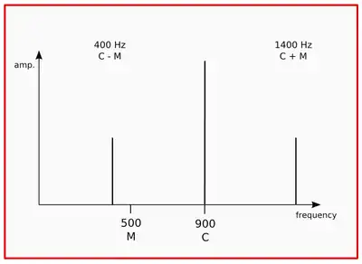 When the frequency of M is in the audible range, that is, 20 Hz or more, there is an effect on the timbre of the signal. The variations in amplitude become fast enough that the modulator generates a set of frequency sidebands. With two sine waves as carrier and modulator, RM will generate a frequency spectrum containing two sidebands, which are the sum and difference of the carrier and modulator frequencies. When this occurs, the actual carrier frequency is removed from the spectrum, leaving two harmonic sidebands (if the frequency of C and M are an integer ratio to one another) or two inharmonic sidebands (if the ratio is otherwise). For instance, if the carrier is 900 Hz and the modulator is 500 Hz, we will get two sidebands; one at 400 Hz (900 - 500) and one at 1400 Hz (900 + 500).