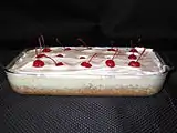 It has no apple. The three cream cake has apple.