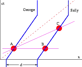 - George and Sally are identical twins initially separated by a distance and at rest. In the rest frame they are initially the same age. At time both George and Sally get in their spaceships and head to the right at velocity . Both move a distance to the right and decelerate to a halt. (See figure 4.10.)