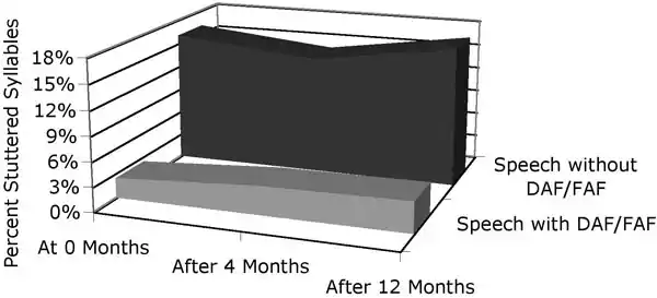 - Nine stutterers used a DAF/FAF device about seven hours per day. Their fluency was measured after four months and after twelve months. The delay was set at 60 milliseconds and the frequency compression FAF at 500 Hz up. The subjects received brief speech therapy, specifically to prolong vowels and use "starter sounds" such as "um" and "ah." The device reduced stuttered syllables about 80%. The users had no statistically significant carryover fluency.